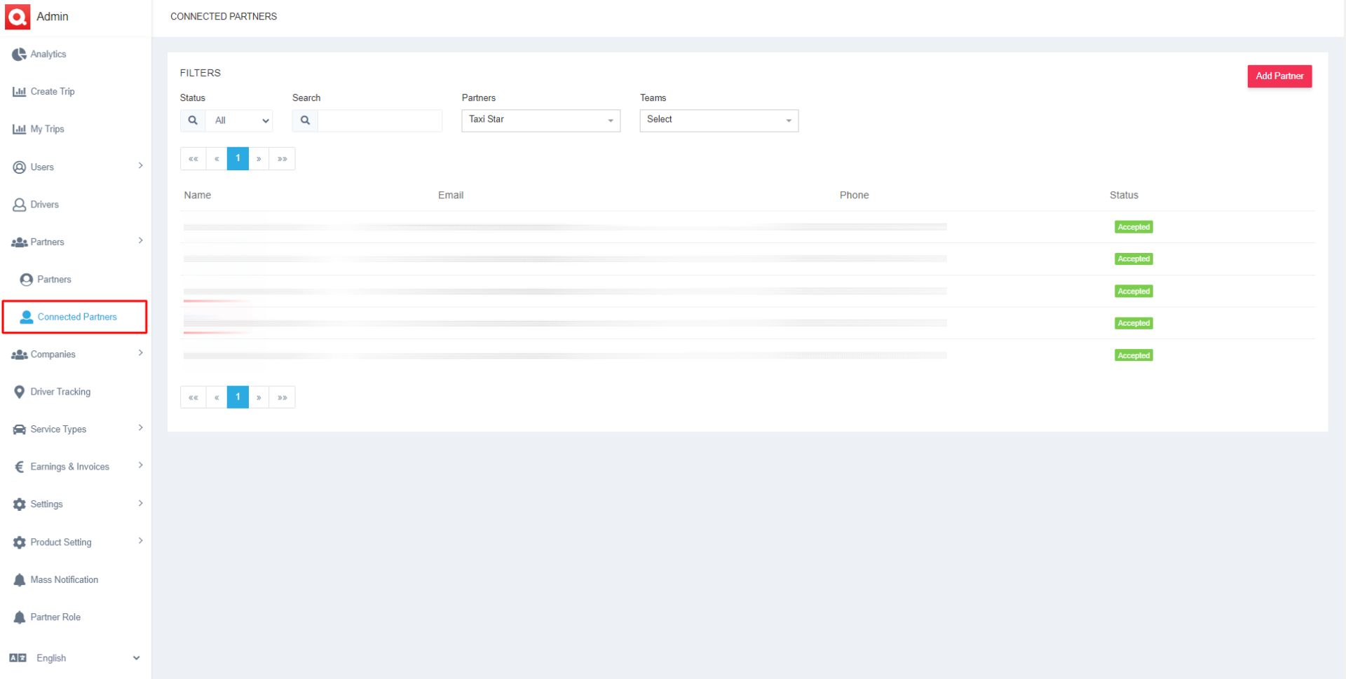 • The list contains the details of the connected partners like Name, Email, Phone, and Status of that connected partner.