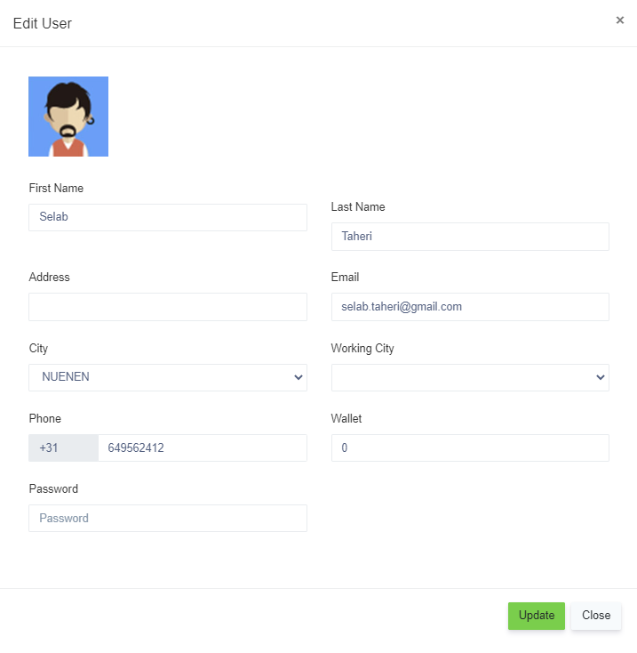 - Edit- The admin can change the details of the drivers, like First Name, Last Name, Address, Email, City, Password, Phone, Wallet, and Subscription.